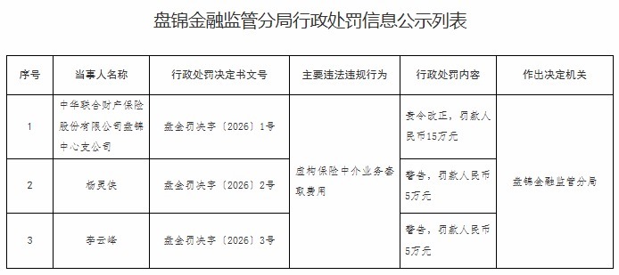 【大河财立方消息】1月8日闪电策略,盘锦金融监管分局披露的行政处罚信息公示列表显示,中华联合财产保险股份有限公司盘锦中心支公司因虚构保险中介业务套取费用被责令改正,并罚款15万元。杨灵侠、李云峰均受到警告并罚款5万元处罚。